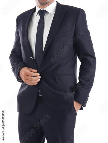 Handsome man in elegant black suit on white background