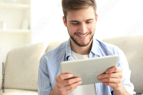Handsome man is using a digital tablet and smiling while resting on couch at home.