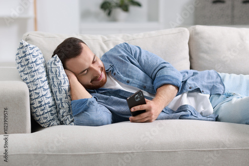 Handsome man looking at smartphone on sofa indoors