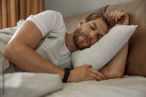 Handsome man sleeping alone in his bed