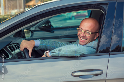 Handsome man smile on face sitting in his car, hands on wheel. Instagram filter effect
