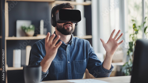 Handsome man trying on virtual reality glasses. Young male software programmer testing new app with 3D virtual reality glasses in office.