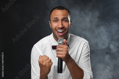 Handsome man with microphone singing on black background