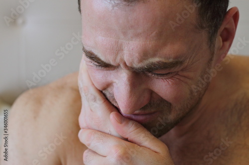handsome middle age man is touching his cheek by his hand, he has a pain of teeth, toothache