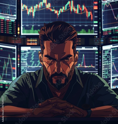 Handsome Stock Trader in Front of Multiple Computer Screens Cartoon Style