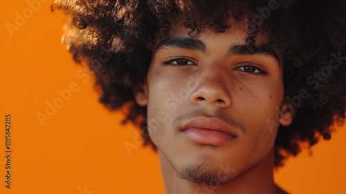 Handsome young Black man with curly afro hairstyle posing against a vibrant orange background in a close-up portrait.