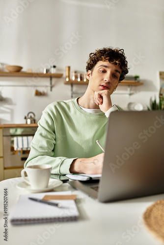 Handsome young man in casual attire reflects in a modern apartment workspace