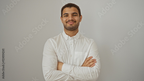 Handsome young man smiling confidently with arms crossed against isolated white background