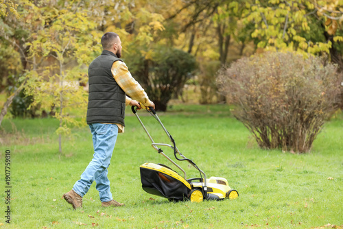 Handsome young man trimming grass with modern lawn mower in backyard