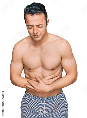 Handsome young man wearing swimwear shirtless with hand on stomach because indigestion, painful illness feeling unwell. ache concept.
