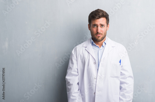 Handsome young professional man over grey grunge wall wearing white coat depressed and worry for distress, crying angry and afraid. Sad expression.