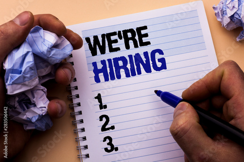 Handwriting text We're Hiring. Concept meaning Recruiting Hiring Now Recruitment Vacancy Announced Hire written by Man Notebook Book Holding Marker the plain background.