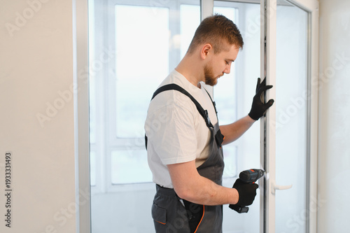 Handyman repairing window frame at home using drill