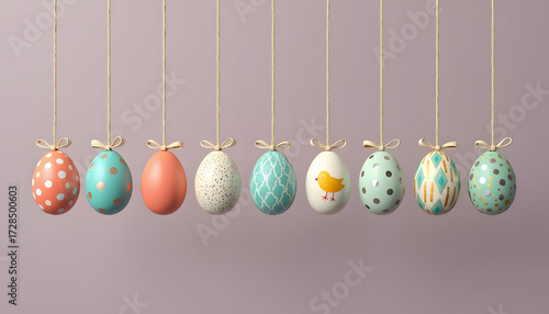 Hanging Easter eggs with various patterns and designs on a purple background.