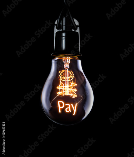 Hanging lightbulb with glowing Pay concept.