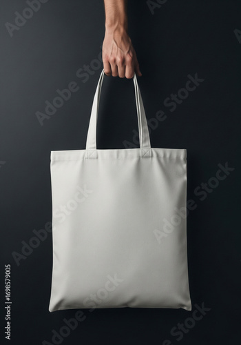 Hanging white tote bag on black background