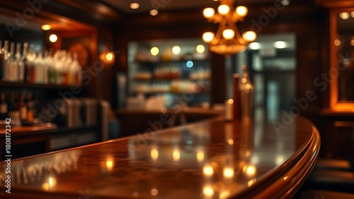 hangout. Classic bar counter with polished surface and ambient glow, background softly blurred. bar promotions, beverage menus, designed for food & beverage menus and cafe branding.