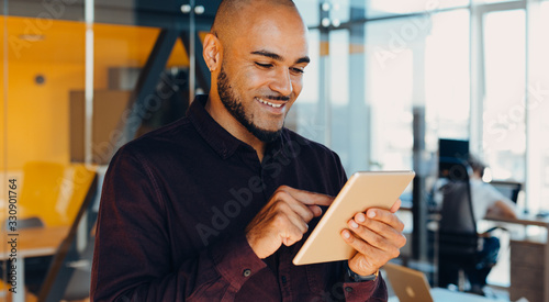 Happy african american businessman or designer or creative man with tablet in hands in modern office, business portrait