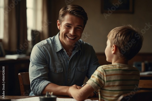 Happy and satisfied little boy show his father good grade on his test