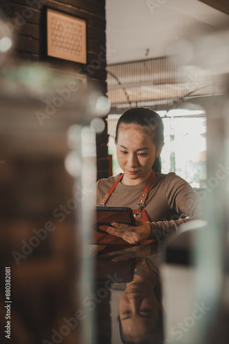 Happy Asian Waitress working with digital tablet in the restaurant