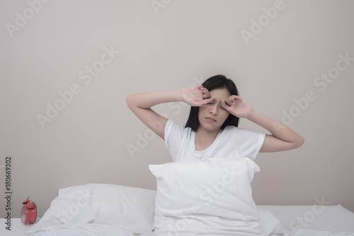 Happy beautiful woman stretching smiling with closed eyes sitting on bed at home woke up in the morning.