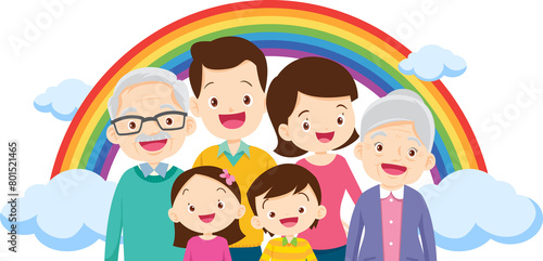 Happy big family standing with house ,rainbow