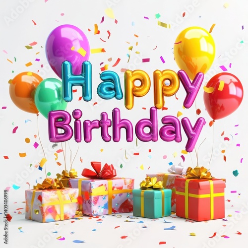 Happy birthday balloons with gifts and confetti isolated on a white background scene