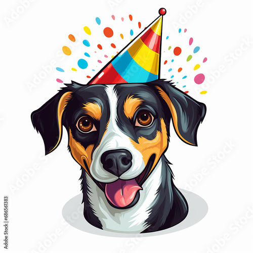 Happy birthday greeting card with cute dog in party hat. Vector illustration.
