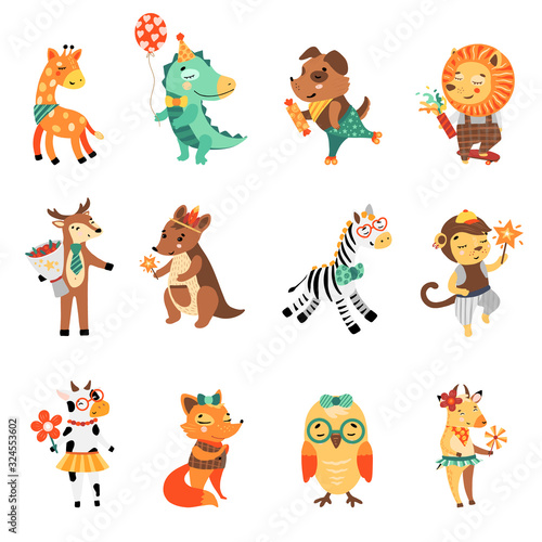 Happy birthday nice animal collection. Vector illustration. Lovely child set of funny charectrers.