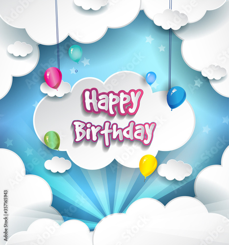Happy Birthday vector design for greeting cards with balloon and clouds, vector illustration for birthday celebration