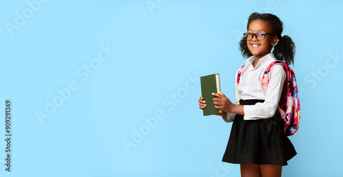 Happy Black Schoolgirl Posing With Book Recommending School Reading List Posing On Yellow Studio Background. Panorama, Copy Space
