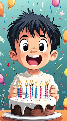 Happy Boy Celebrating Birthday With Cake And Balloons