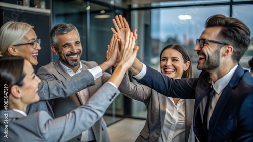 Happy, business people and high five with team for collaboration, motivation or success at office. Group, employees and hands together with unity for solidarity, community or mission at workplace