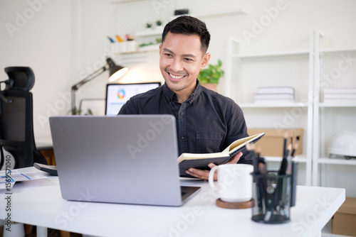 Happy businessman taking notes in a notebook while working with laptop and paperwork in a office.