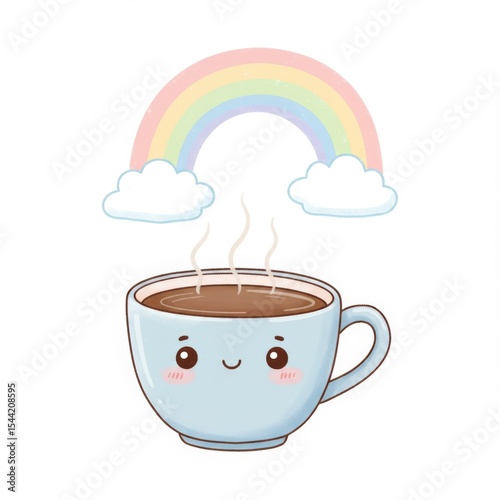 Happy Cartoon Coffee Cup with Rainbow and Clouds
