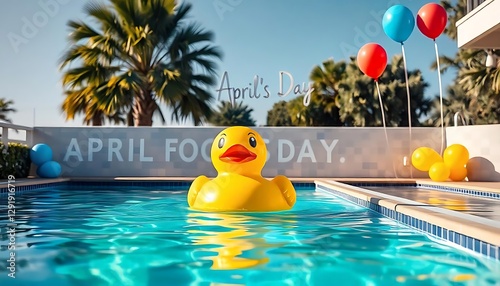 Happy Cartoon Duck Swimming in the Resort Pool, Enjoying the Fun and Laughter of April Fools' Day