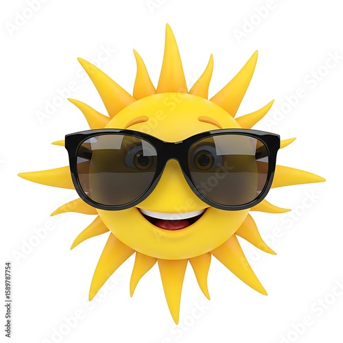 Happy cartoon sun wearing sunglasses; cheerful summer 3D render.