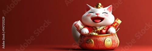 Happy Cat Figurine Holding Festive Red Bag