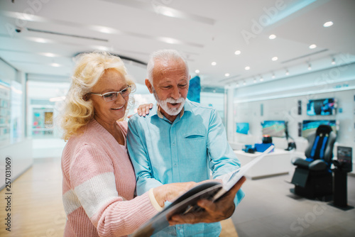 Happy Caucasian senior couple looking at brochure and choosing what to buy while standing in tech store.