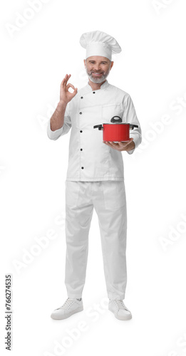 Happy chef in uniform with cooking pot showing OK gesture on white background