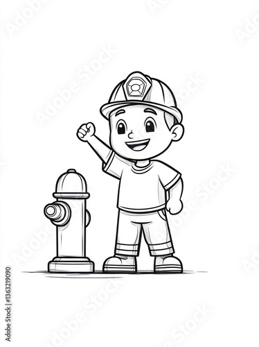 Happy child firefighter near hydrant; coloring page