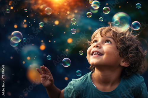 Happy child playing with colored soap bubbles. Joyful moments of carefree fun and entertainment, embracing playful exploration and boundless excitement