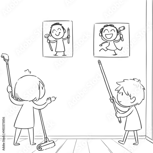Happy Children Hanging Artwork on Wall, Simple Line Art Illustration