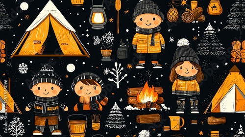 Happy children winter camping seamless pattern, campfire, snowy forest background, ideal for fabric, textile, wallpaper