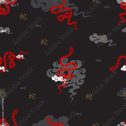 Happy Chinese new year 2025 Year of the snake,Seamless Pattern paper red Chinese Snake and asian elements,white cloud on black background,Translation, Happy New Year 2025,Snake Zodiac