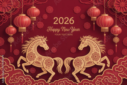 Happy Chinese new year 2026. Horse zodiac sign on red background. Asian elements with craft paper cut style lantern flower clouds. Translation Happy new year, Year of the horse.