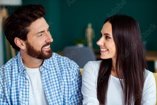 Happy couple indoors share smiles in living room, a cozy moment between partners.