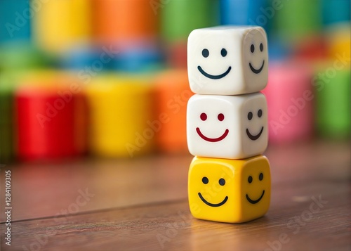 Happy Cubes Stacked on a Wooden Surface: Positive and Playful Image for Business