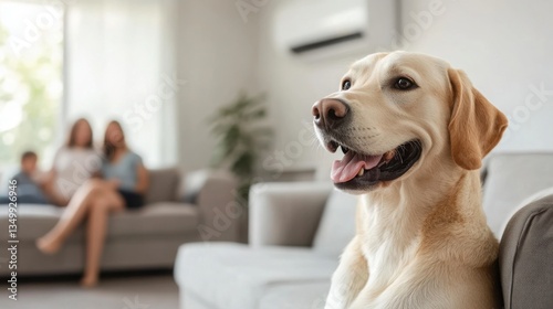 Happy dog enjoys cool air from air conditioner while family relaxes together at home