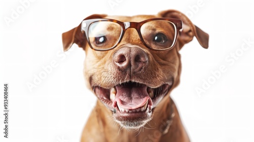 Happy dog on white background, wearing sunglasses